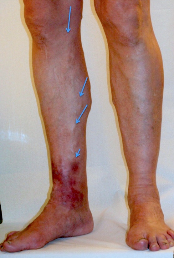 3.-  Les varices tronculaires , nommées anciennement varices  « internes » car souvent plus profondes .Leur calibre normal de 4-5 mm  peut aisement doubler ou tripler et engendrer une dysfonction des valvules qui normalement  font que flux veineux ne peut que remonter dans le réseau veineux .